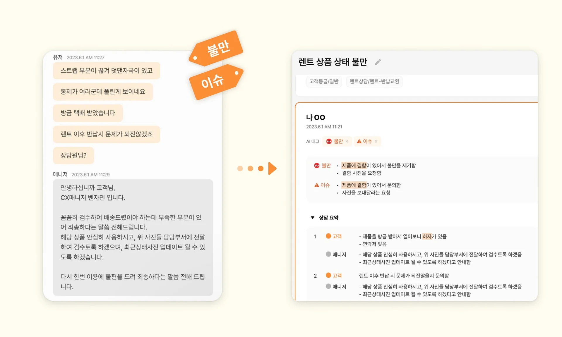 1번은 AI가 자동으로 불만/이슈를 분류해 준 리포트인데요. 전체적인 큰 이슈나 불만을 확인하고, 서비스상에서 수정이 긴급하다고 판단되는 내용들을 정리해서 임원진과 개발팀/사업팀에 공유하는 용도로 사용하고 있어요.