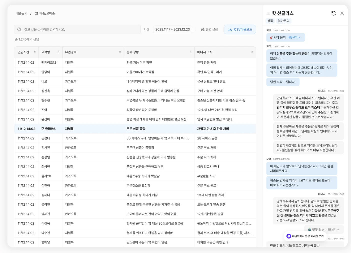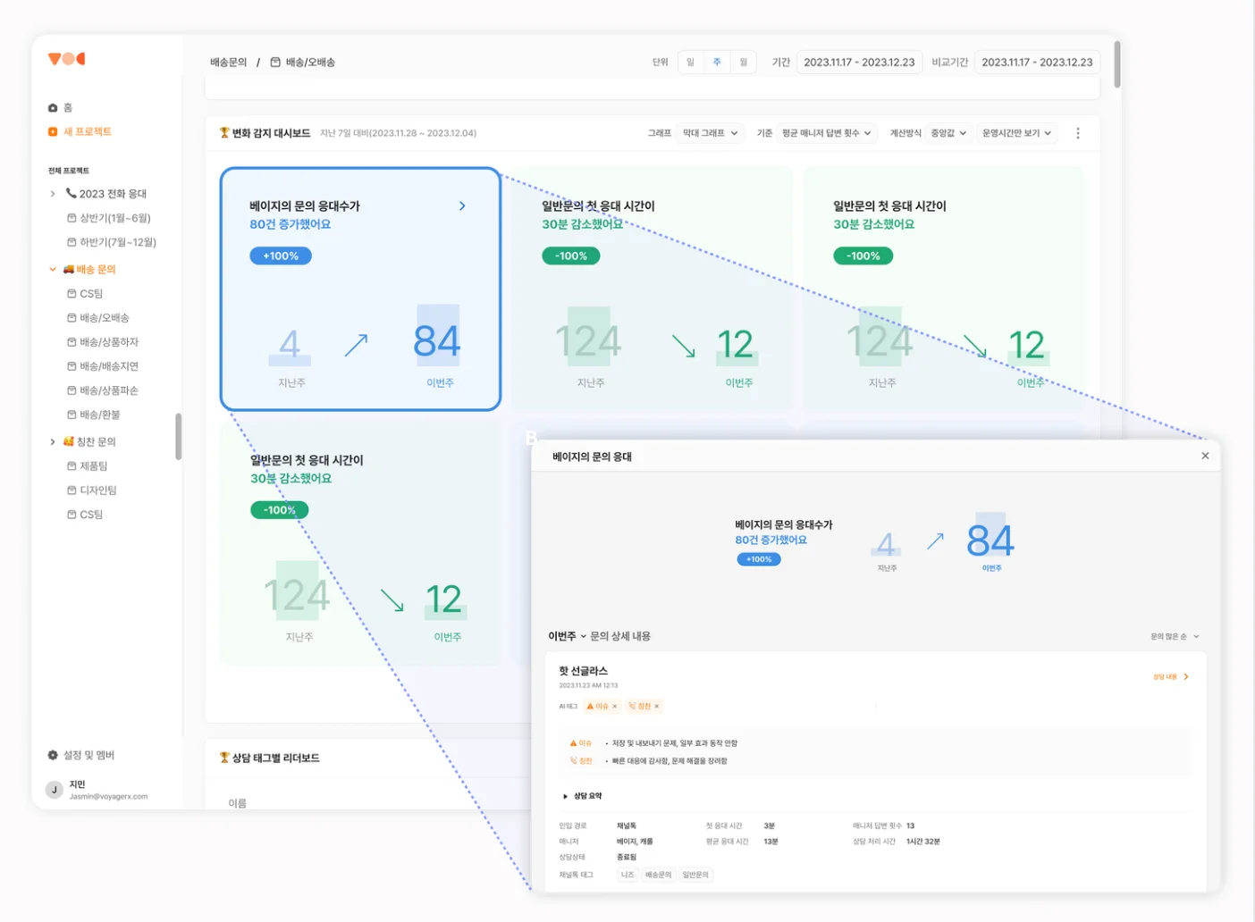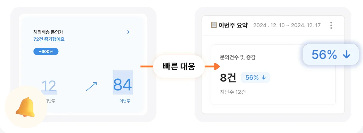 배송 문의 중에서도 상품 하자 문의가 많은지, 배송 지연 문제가 많은지 등의 트렌드를 비교하면서 주요 이슈를 트래킹하면서 예측 가능한 문제도 미리 대응할 수 있습니다.
