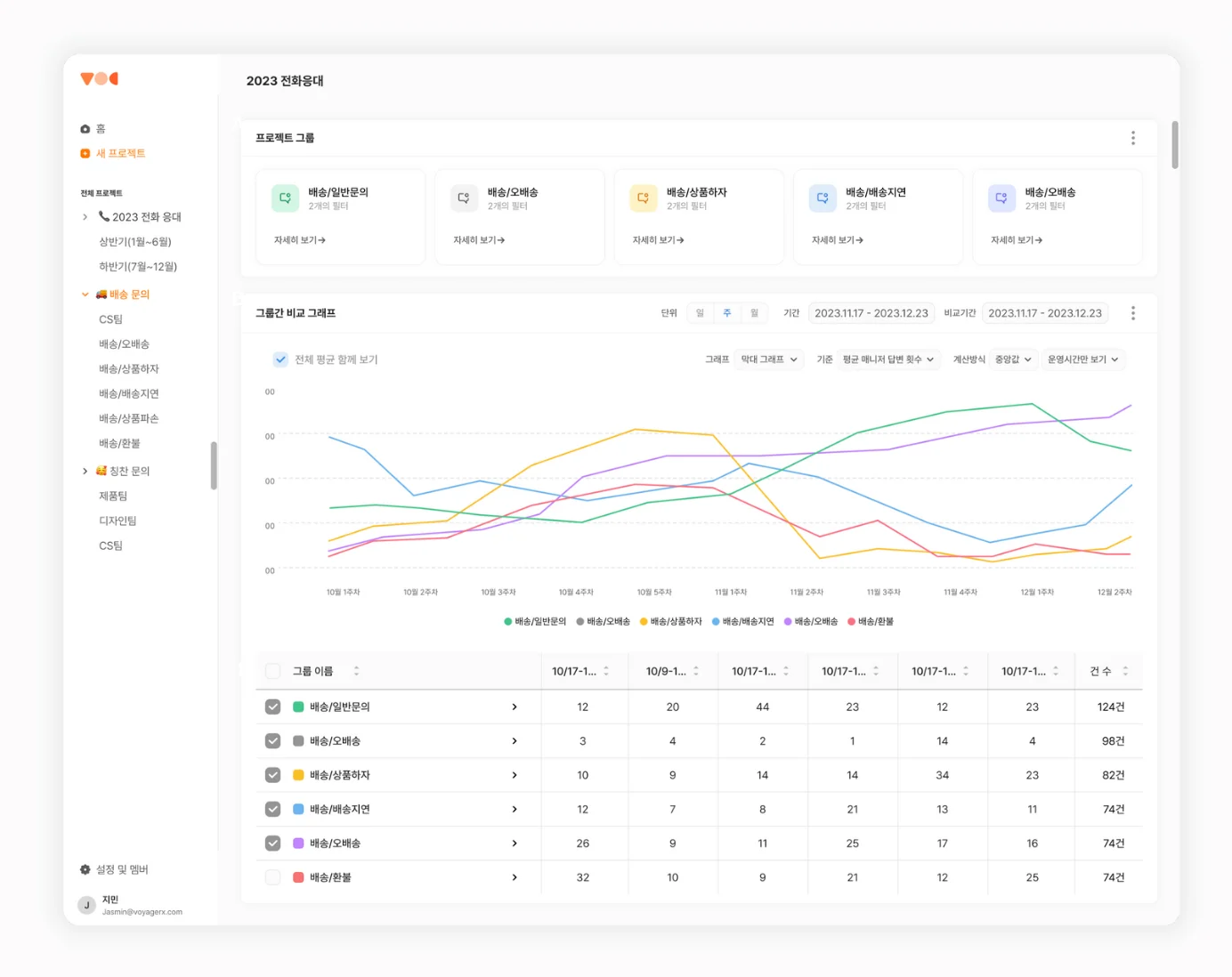 그룹별 비교 그래프 기능은 다양한 주제의 문의들을 버드아이뷰로 볼 수 있게 도와줍니다.