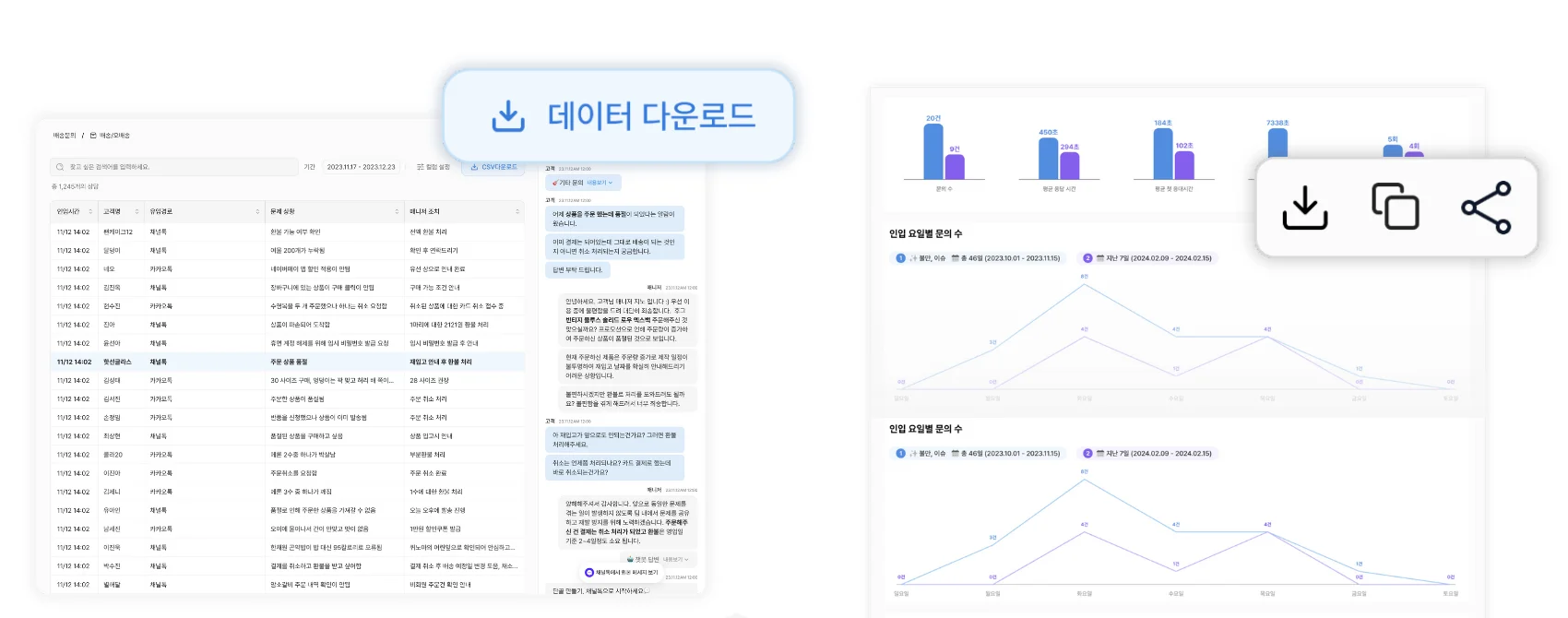 문의 하나하나 정리하면서 문제를 파악하던 불편함은 줄이고, 대시보드를 통해 가설을 먼저 세우고 구체적 문의를 통해 근거를 찾는 방식으로 빠르고 효율적으로 비즈니스 인사이트를 찾을 수 있습니다.