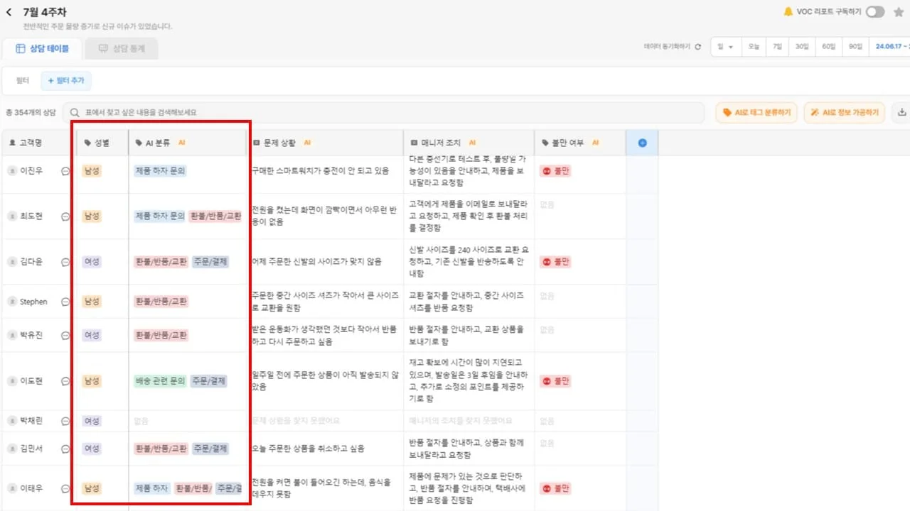 이처럼 올바르게 VOC 분석을 하기 위해서는 단순히 만족도를 정량화하는 것을 넘어 그 내용에서 구체적인 인사이트를 도출할 수 있어야 합니다. 이를 위해서는 VOC 내용에 대한 요약과 긍정/부정 반응을 분석하는 과정이 필수적이고, 연령/성별/회원 등급 등 고객의 배경 정보도 한 눈에 볼 수 있다면 더욱 깊이 있는 인사이트를 얻을 수 있는데요.