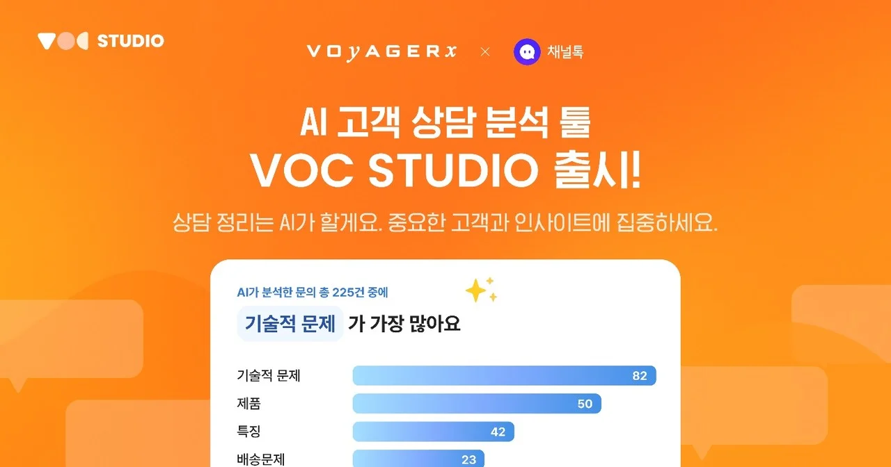 VOC STUDIO는 매니저와 고객의 대화를 문제 유형별로 정리하고, 한눈에 볼 수 있는 대시보드로 제공합니다. AI가 문의를 자동으로 모아 분류하기 때문에 CS 담당자는 보기 쉽게 정리된 데이터에서 인사이트를 발견하는 데 집중할 수 있습니다. 이제 우리 브랜드도 고객 데이터 분석을 시작해보세요. 번거롭고 어려운 과정은 모두 VOC STUDIO에게 맡기고 고객 만족도를 높이는 업무에 더 집중할 수 있습니다!