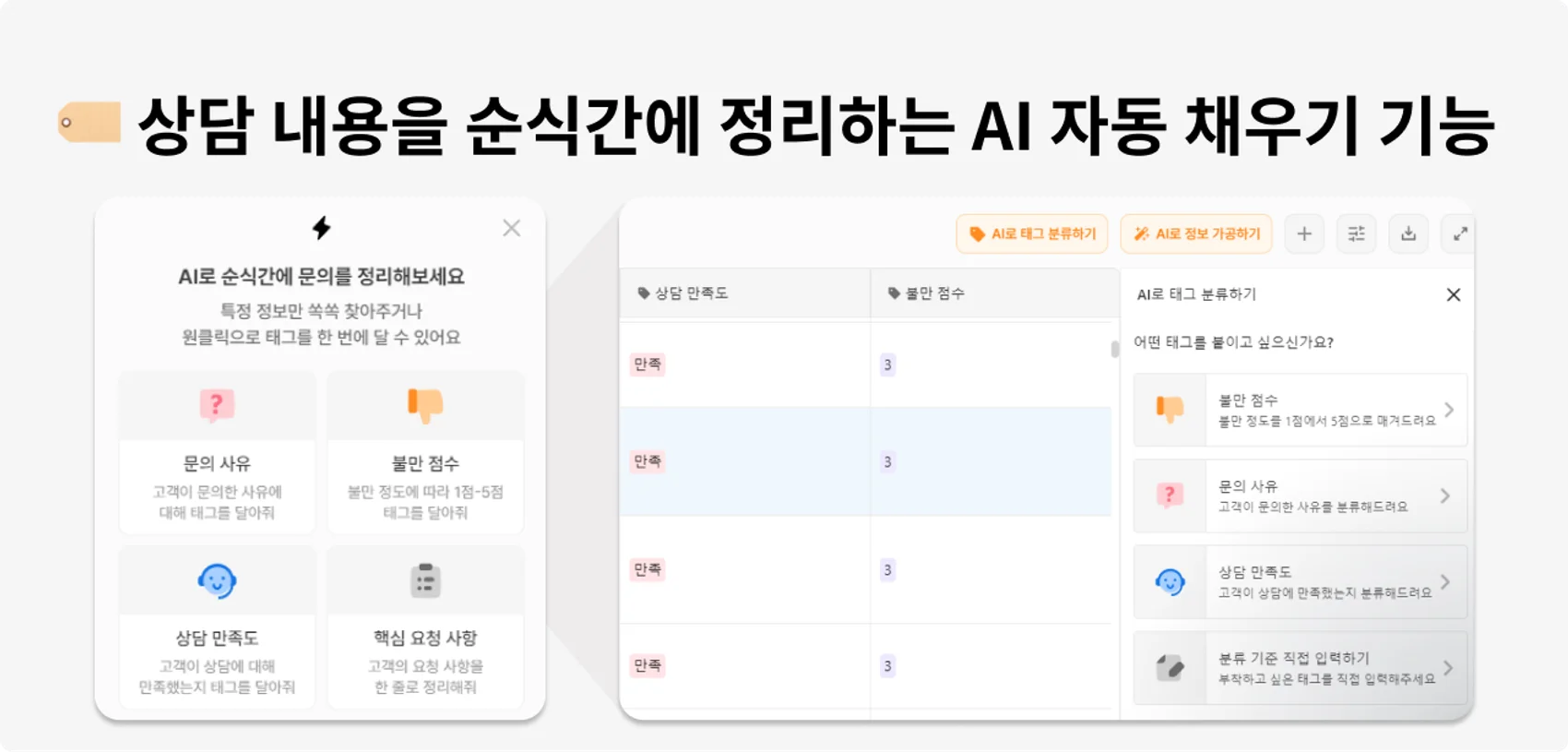아직도 엑셀의 <Ctrl + F> 검색 기능으로 원하는 VOC 데이터를 일일이 찾아보고 계신가요? 수많은 VOC 데이터 중 딱 필요한 정보들만 뽑아 보고 싶을 때, 이젠 VOC 스튜디오의 AI 자동 채우기 기능을 사용해 보세요. AI가 스스로 상담 내용을 분석해 단 한 번의 클릭만으로 원하는 방식의 데이터가 뚝딱 생성돼요. 긴 상담 내용에서 '고객의 핵심 요청 사항'만 추출해 테이블의 칼럼을 완성해 줄 뿐만 아니라, 상담사별 뒤죽박죽 통일성 없던 VOC 태그도 일정한 기준에 맞춰 깔끔하게 정리해 줍니다. VOC 스튜디오 AI 매니저의 도움을 받아 방대한 데이터에서 원하는 데이터만 쏙쏙 뽑아 빠르게 분석하세요.