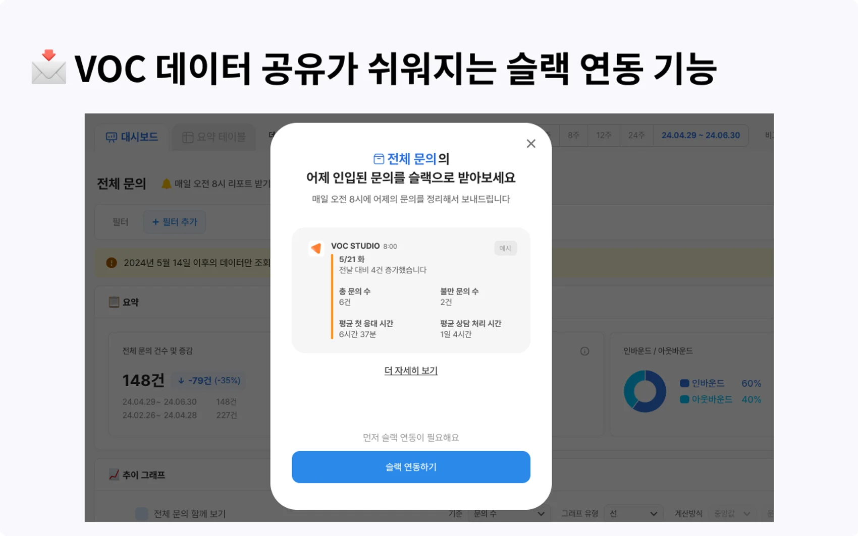 VOC 스튜디오는 VOC 데이터를 손쉽게 공유할 수 있는 슬랙 연동 기능을 제공하여 내부 협업을 강화할 수 있습니다. VOC 데이터를 실시간 수집하고, 한눈에 파악할 수 있도록 다양한 도표와 차트 형태로 정리해 줄 뿐 아니라, 전일 VOC 현황을 요약해 매일 슬랙으로 전달해 줍니다. 또한 필요한 데이터만 분류하고, 해당 데이터만 엑셀 파일로 추출할 수 있어 데이터 공유가 쉬워지지요. VOC 스튜디오를 활용하여 내부 협업의 효율성을 높이고, 고객 중심의 조직 문화를 강화해 보세요.
