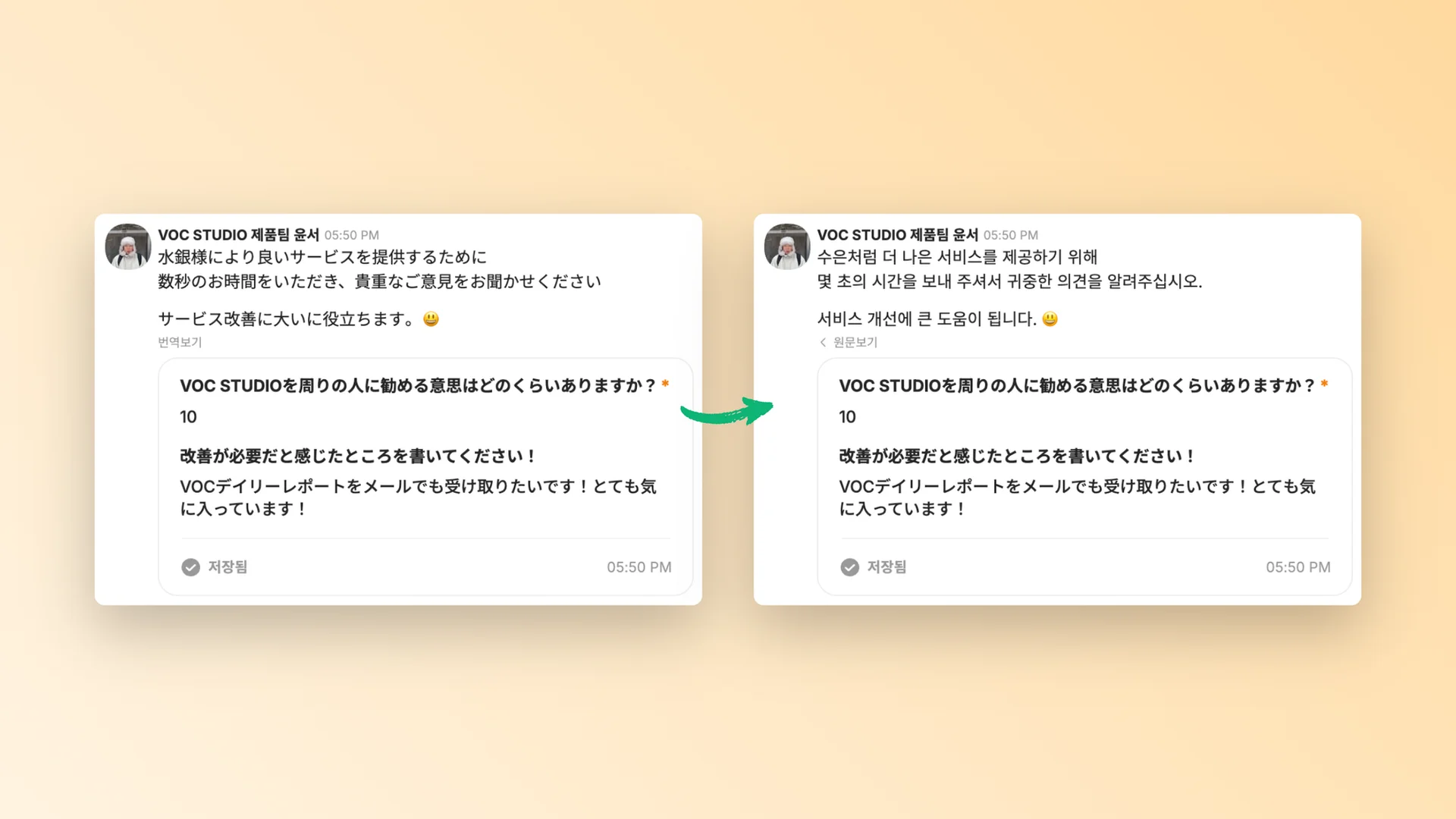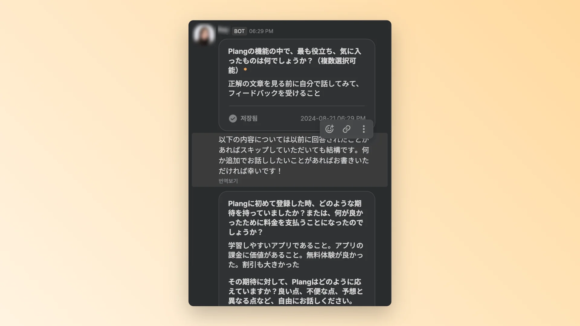 그리고 번역이 되지 않는 것도 문제였습니다. 채널톡에서 일반 메세지 번역은 지원했지만 유저가 남긴 입력폼 결과는 번역이 불가능했거든요. 어쩔 수 없이 입력폼 결과를 복사해 외부 번역기를 사용해야 됐습니다.