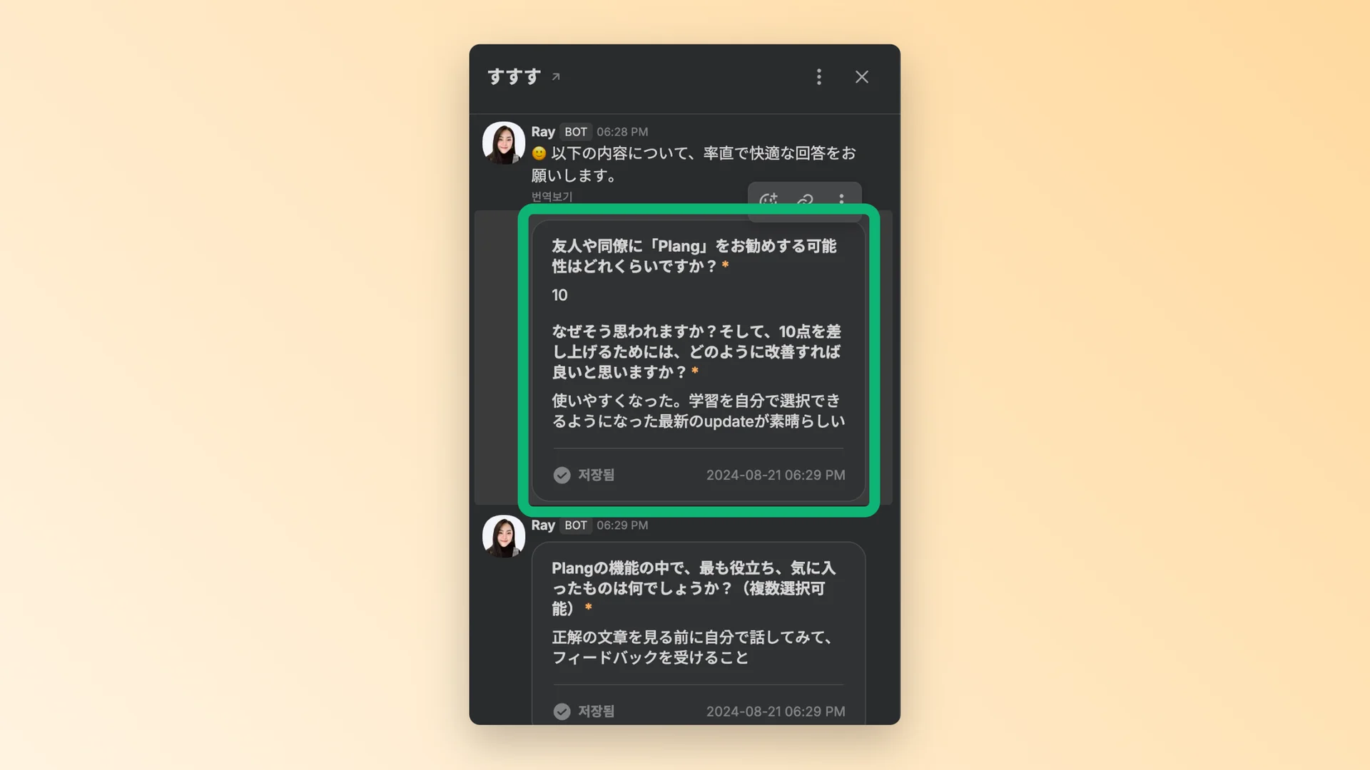 Plang 에서는 채널톡 입력폼 기능을 사용해 NPS 서베이를 진행하는데요. 채널톡 워크플로우로 입력폼 질문을 유저에게 보내고, 입력폼에 유저가 답을 남기는 방식이죠.